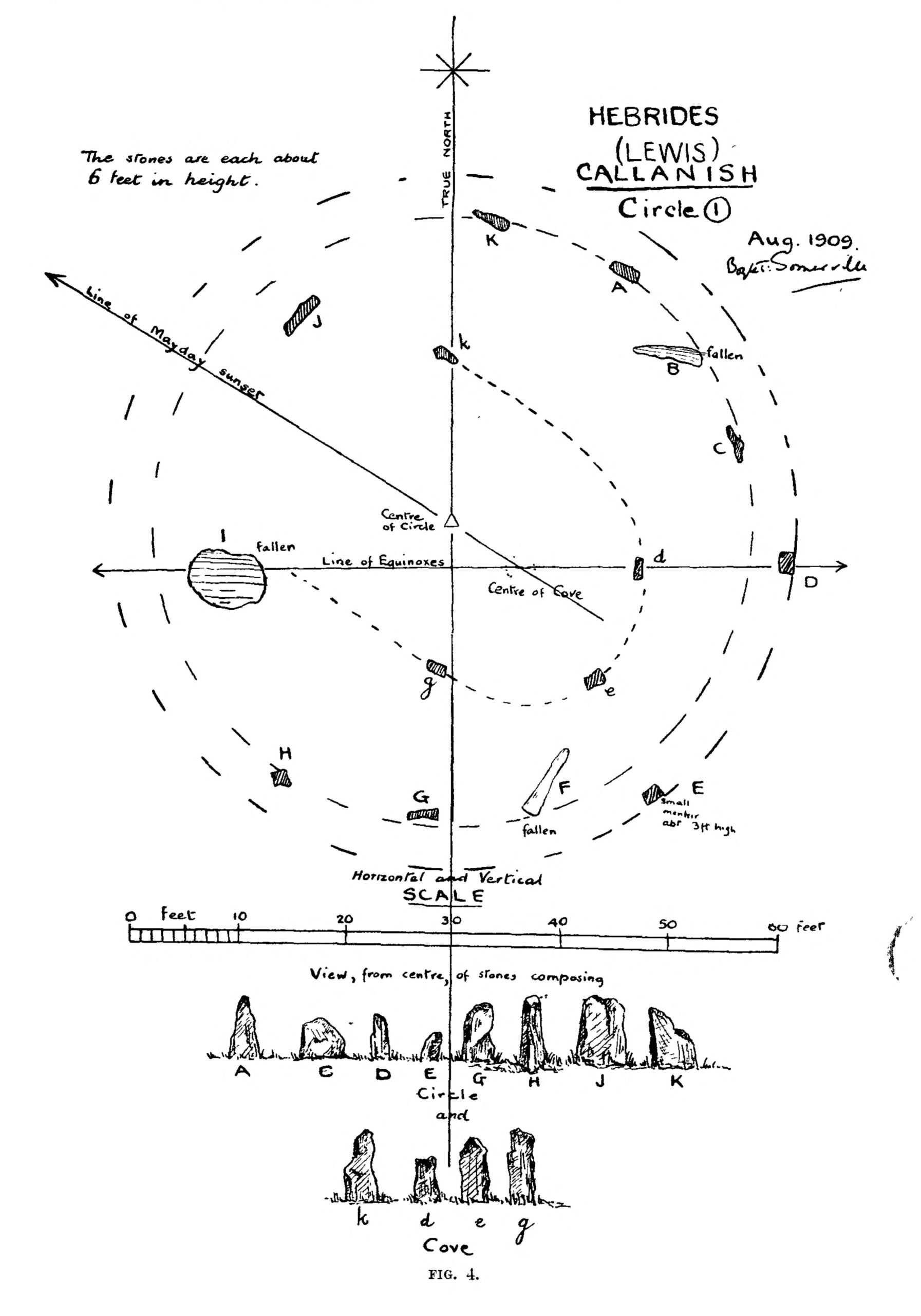 📐 Boyle Somerville’s Survey of Callanish I (1909) In the summer of 1909, Vice-Admiral Boyle Somerville, a distinguished naval hydrographer and early archaeoastronomer, conducted a meticulous theodolite and chain survey of the Callanish I stone circle on the Isle of Lewis. His plan, plotted at a scale of 1 inch to 8 feet, revealed the monument’s complex geometry: a central circle of 13 standing stones surrounding a tall monolith and chambered tomb, with four stone avenues radiating outward.