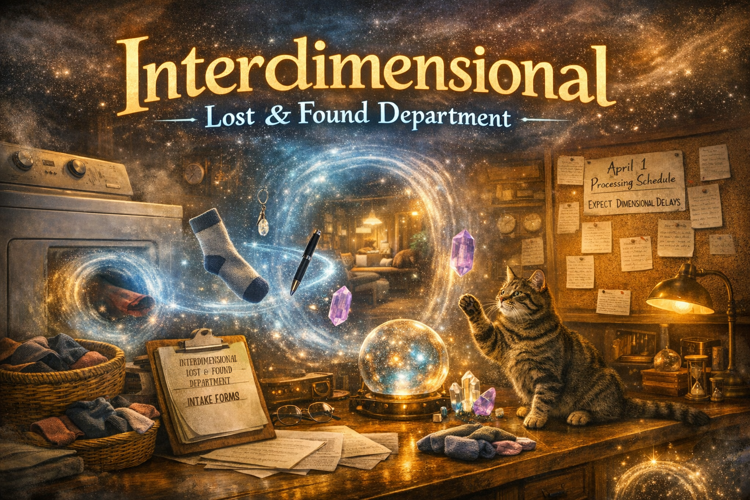 The Interdimensional Lost & Found Department is a playful, fictional concept created for seasonal humor. It is not a real service, nor does it represent metaphysical, therapeutic, or practical claims. No actual retrieval of socks, pens, crystals, or other items will be performed. Please enjoy the whimsy — and check under the couch one more time. Happy April Fools’ Day.