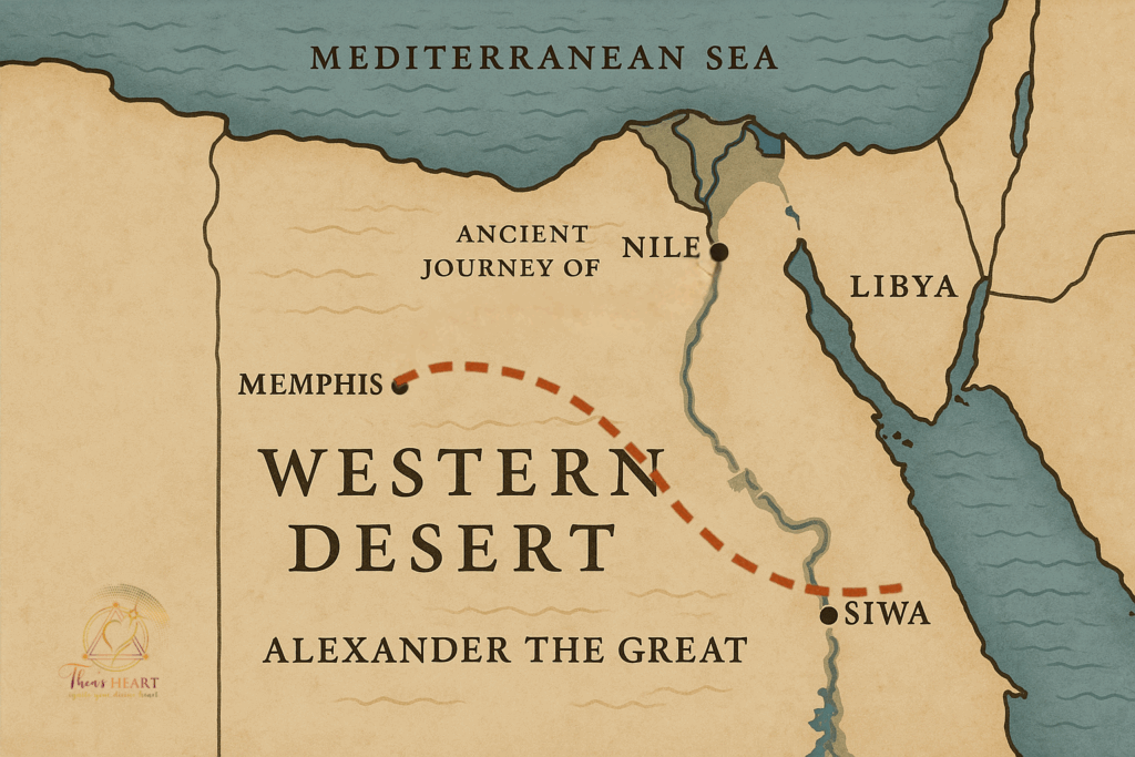 The journey to Siwa was grueling, spanning approximately 350 miles (560 kilometers) from Memphis through the Western Desert—a land of shifting sands, scorching heat, and treacherous terrain. Ancient accounts suggest it took several weeks, by foot and camel, though exact records are unclear. Some legends claim divine intervention guided Alexander’s army when they lost their way, with ravens or serpents appearing to lead them forward or when they ran out of water, they received rainfall (University of Birmingham, 2014).  The dangers of the desert were well known—50,000 Persian soldiers sent by Cambyses II to destroy the oracle vanished in a sandstorm centuries earlier, according to Herodotus. His arrival at Siwa did more than satisfy a spiritual quest; it reinforced his legitimacy as a ruler. The priests declared him the son of Zeus-Ammon, solidifying his claim to divine favor. This moment shaped his legacy, linking Macedonian rule to Egyptian tradition.