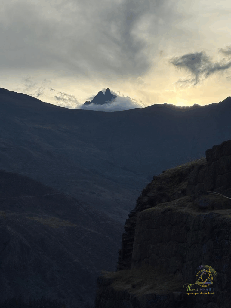 Yet for me, what captivated my attention was a peak shrouded in clouds—Huacay Willka. Some of our starseeds climbed the steps to see it from the Temple of the Sun. I observed the mountain from the terrace below—it pulls you in—as I waited for others to make their way to the entrance. It was after the 5:30 PM closing time, and the site still buzzed with tourists reluctant to leave. That’s when the cloud formation parted to reveal a triangular-shaped peak on the eastern skyline. It was a magical view.